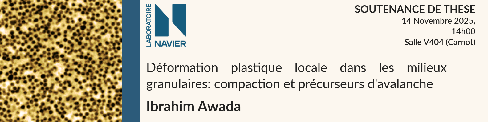 Ibrahim Awada, doctorant au sein de l’équipe RMP, soutiendra sa thèse « Déformation plastique locale dans les milieux granulaires : compaction et précurseurs d’avalanche » le vendredi 14 Novembre à 14h00 en salle V404.